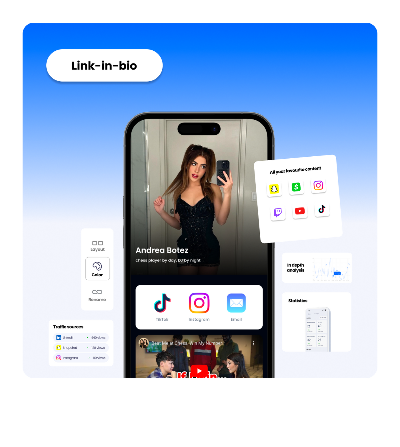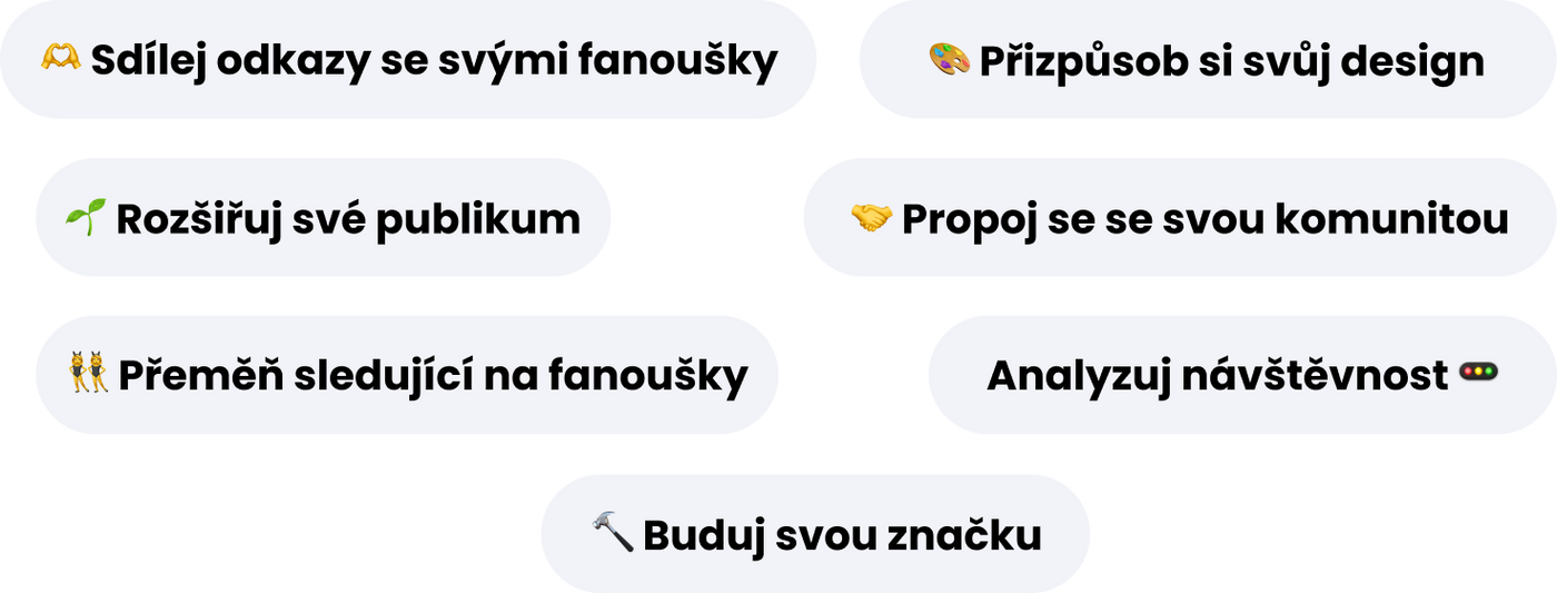 Sdílej svůj Instagram, TikTok, YouTube, Twitch, X, Snapchat a veškerý další obsah na jednom místě. Ukaž svým fanouškům, kde tě najdou. Tvoje stránka. Tvůj obsah.