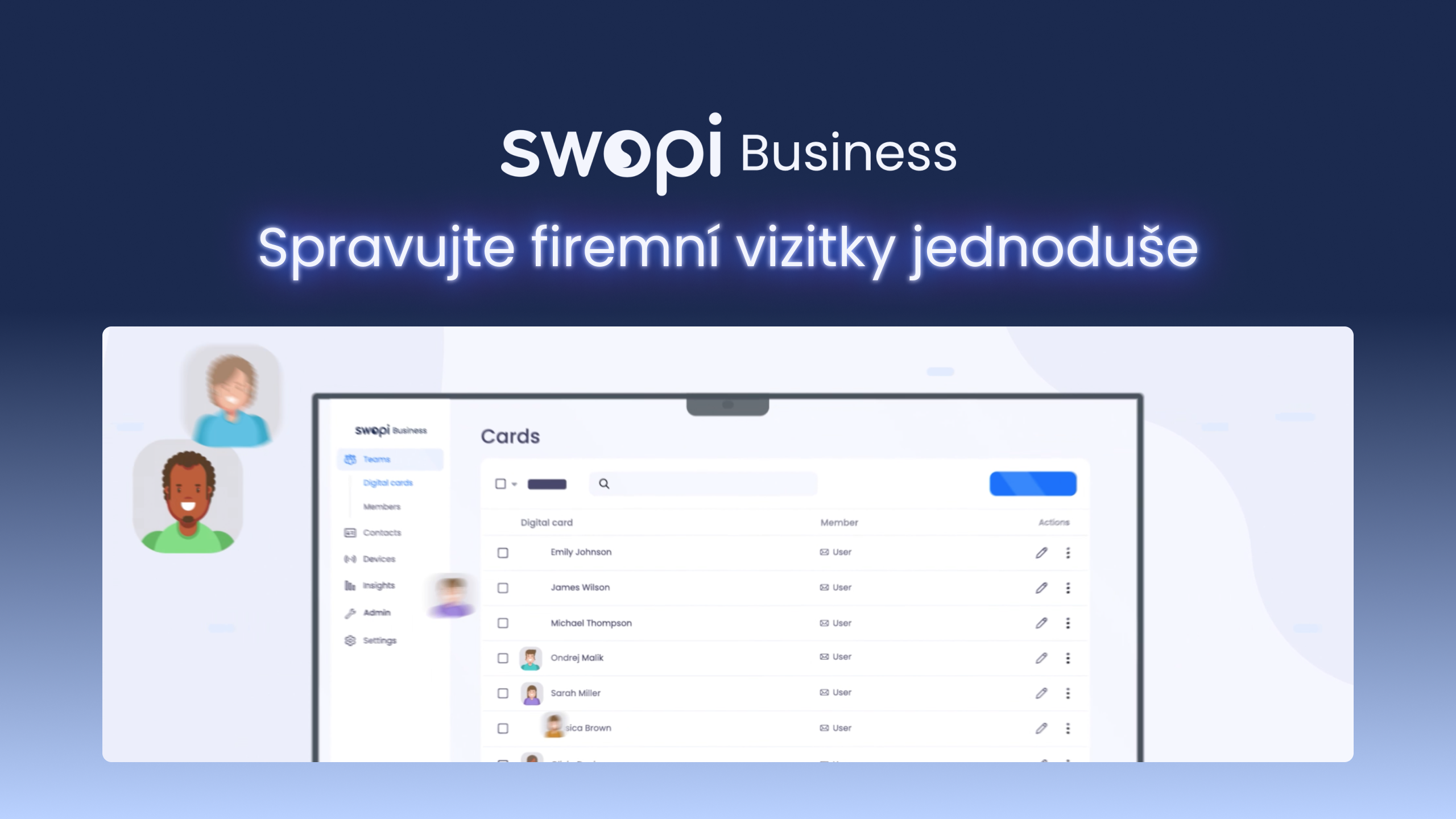Swopi Business nabízí moderní správu týmových vizitek, mobilní aplikaci, sběr leadů, CRM integraci, AI skener papírových vizitek, GDPR compliance, kvalitní zákaznický servis a přizpůsobitelné digitální vizitky pro profesionální prezentaci.
